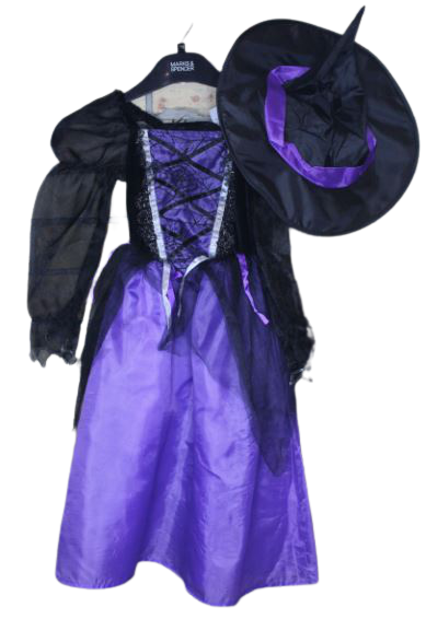 Boszorkány jelmez kalappal. A felső része rugalmas plüss anyagú, dereka gumis.