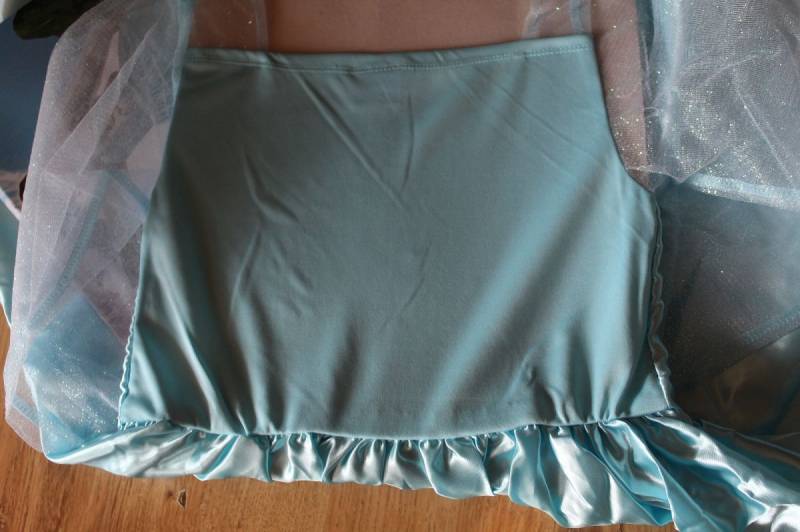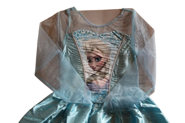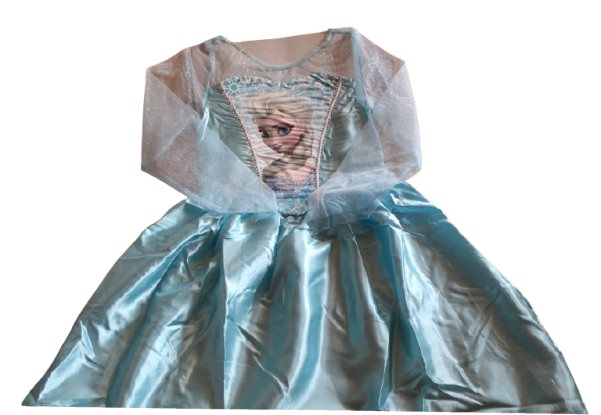Elza jelmez, a Jégvarázsból. A ruha hátulja picit enged, de nem sokat, belebújós. A dereka nem gumis. Nagyon szép fényes anyagból van.