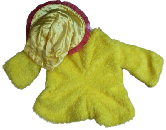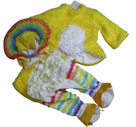 Kislány 3 részes pihe-puha anyagú szivárvány jelmez. A felső belebújós, hátul patentos, az eleje rövidebb. A nadrág dereka gumis, belső lábszárnál végig patentos. Jár hozzá egy aranyos megkötős kalap.