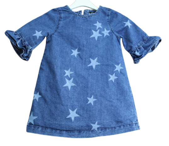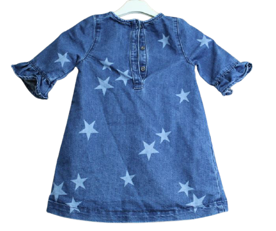Kislány farmer ruha, hátul gombos, háromnegyedes ujjú, nem elasztikus.