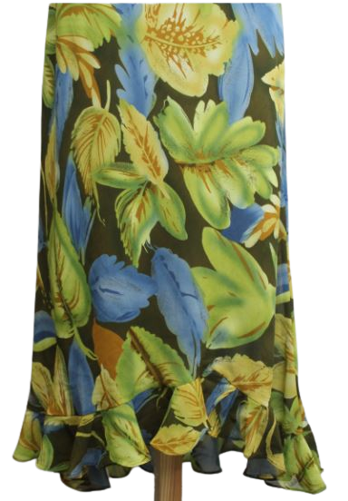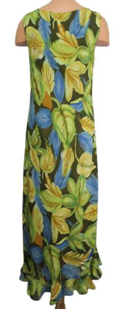 Női hosszú ruha, eleje picit rővidebb, fodros aljú. Belebújós, béléses, nem elasztikus.
