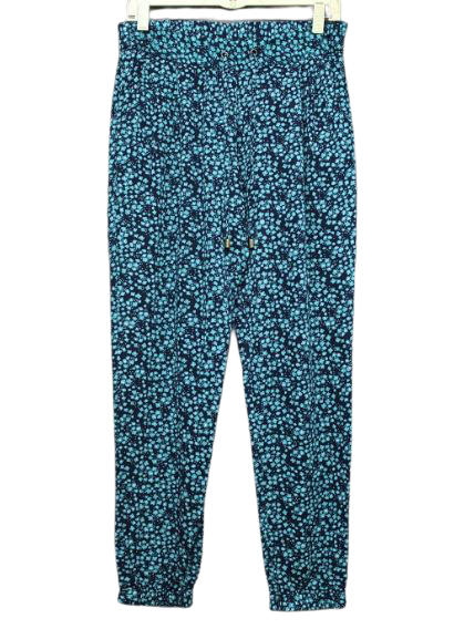 Női hosszúnadrág, virágmintás, elején megkötős, dereka hátul gumis.