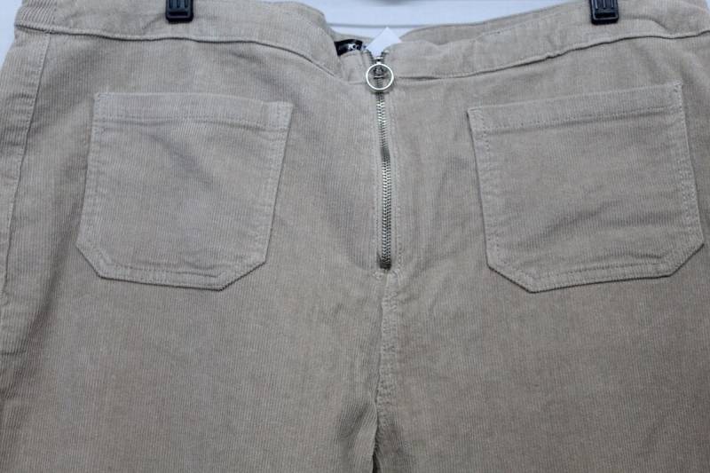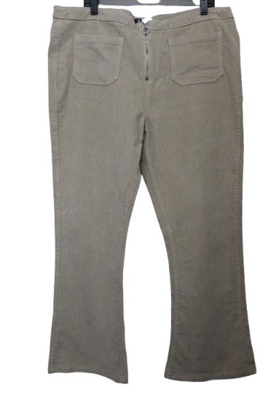 Nagy méretű, rugalmas anyagú kordbársony nadrág. Elején zipzárral, trapéz aljjal.