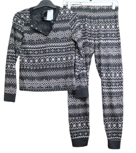 Női pizsama szett (hoszúujjú felső, hosszú nadrág), a nadrág dereka gumis, felső elején patentos.