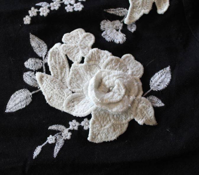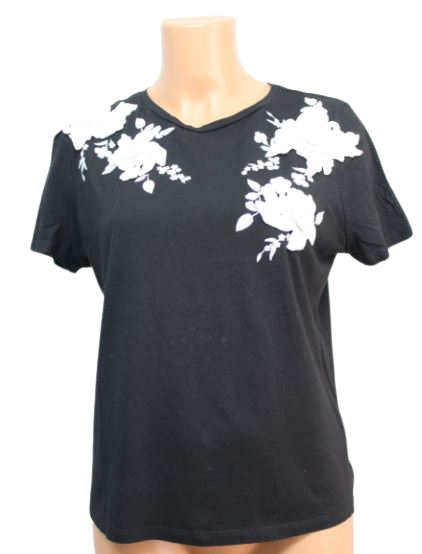 Női rövid ujjú felső, rávarrt hímzett virágokkal.